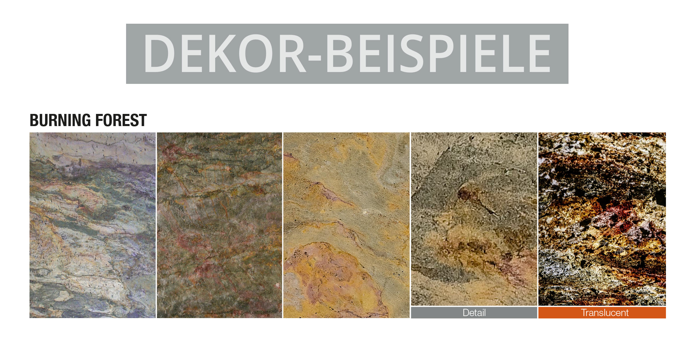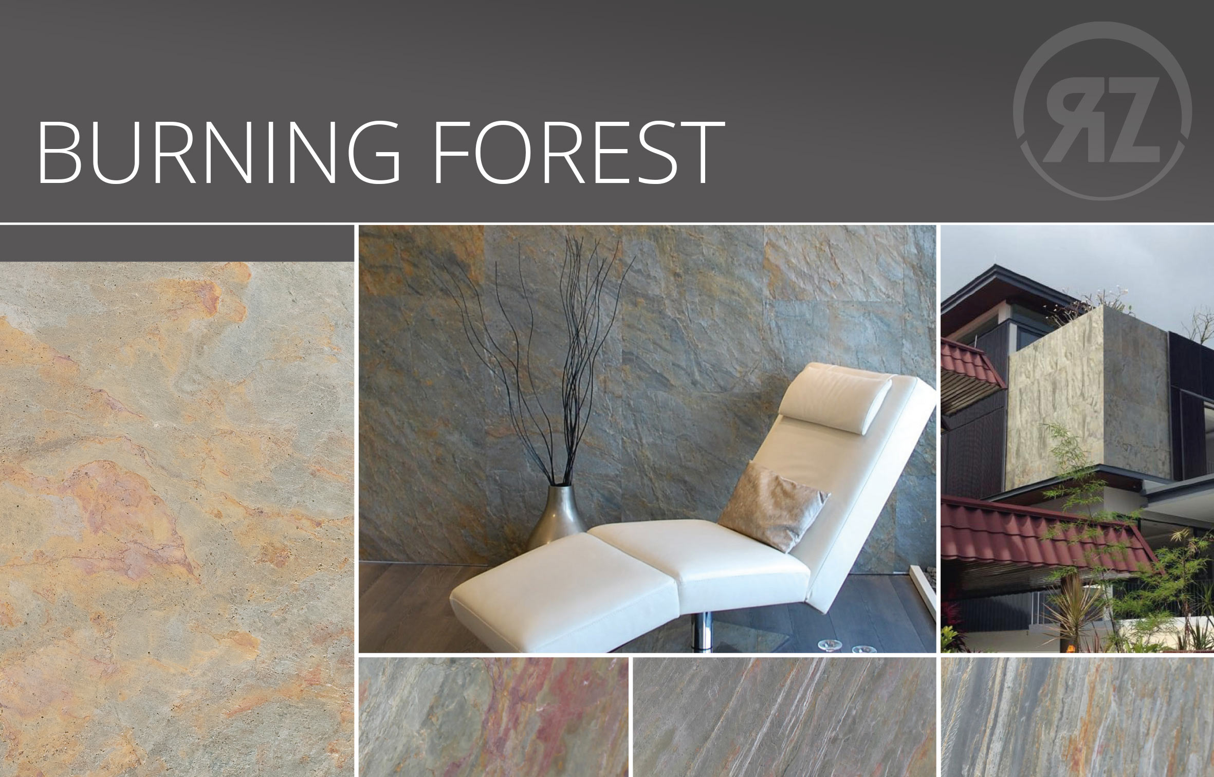 Burning Forest ist ein Glimmerschieferdekor mit einer echten Steinoberfläche. Der besondere Glimmereffekt entsteht durch einen erhöhten Anteil an Feldspat. Insgesamt ist die Oberfläche härter und weist eine stärkere Struktur auf, somit eignet sich dieses Material besonders für Wände als auch für Fußböden. Meistens bleibt der Glimmerschiefer sehr farbstabil in der Maserung der Oberfläche.