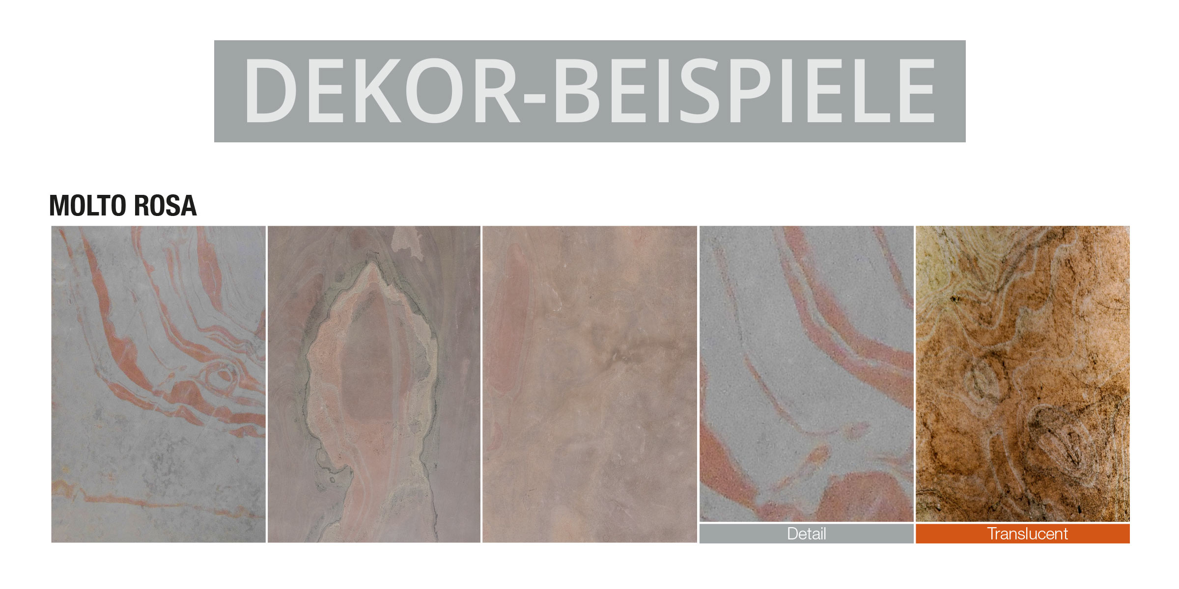 Molto Rosa ist ein Buntschieferdekor mit einer echten Steinoberfläche Der Buntschiefer zeichnet sich durch matte Farben, aber oft sehr stark durchwachsene Verläufe mit blumigen Mustern aus.